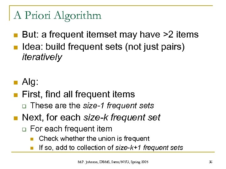 A Priori Algorithm n n But: a frequent itemset may have >2 items Idea: build frequent sets (not just pairs) iteratively Alg: First, find all frequent items q n These are the size-1 frequent sets Next, for each size-k frequent set q For each frequent item n n Check whether the union is frequent If so, add to collection of size-k+1 frequent sets M. P. Johnson, DBMS, Stern/NYU, Spring 2005 36