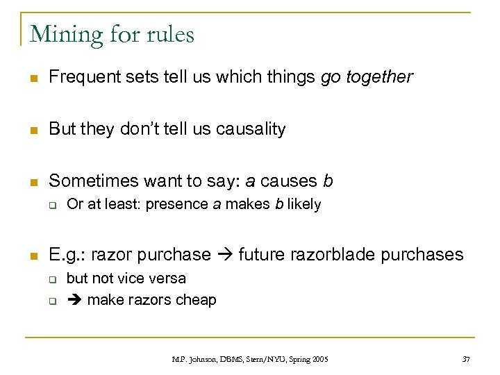 Mining for rules n Frequent sets tell us which things go together n But they don’t tell us causality n Sometimes want to say: a causes b q n Or at least: presence a makes b likely E. g. : razor purchase future razorblade purchases q q but not vice versa make razors cheap M. P. Johnson, DBMS, Stern/NYU, Spring 2005 37