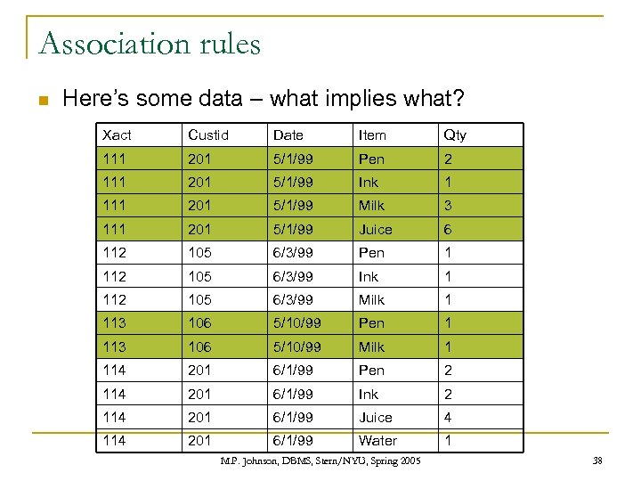 Association rules n Here’s some data – what implies what? Xact Custid Date Item Qty 111 201 5/1/99 Pen 2 111 201 5/1/99 Ink 1 111 201 5/1/99 Milk 3 111 201 5/1/99 Juice 6 112 105 6/3/99 Pen 1 112 105 6/3/99 Ink 1 112 105 6/3/99 Milk 1 113 106 5/10/99 Pen 1 113 106 5/10/99 Milk 1 114 201 6/1/99 Pen 2 114 201 6/1/99 Ink 2 114 201 6/1/99 Juice 4 114 201 6/1/99 Water 1 M. P. Johnson, DBMS, Stern/NYU, Spring 2005 38