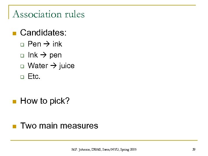 Association rules n Candidates: q q Pen ink Ink pen Water juice Etc. n How to pick? n Two main measures M. P. Johnson, DBMS, Stern/NYU, Spring 2005 39