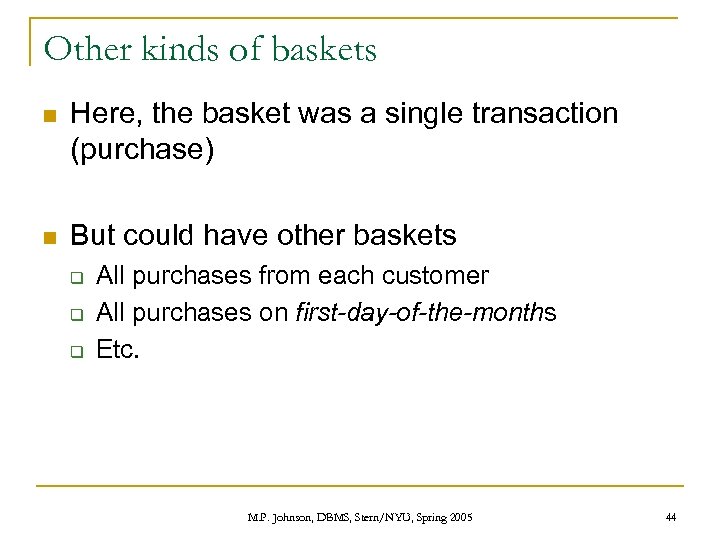 Other kinds of baskets n Here, the basket was a single transaction (purchase) n But could have other baskets q q q All purchases from each customer All purchases on first-day-of-the-months Etc. M. P. Johnson, DBMS, Stern/NYU, Spring 2005 44