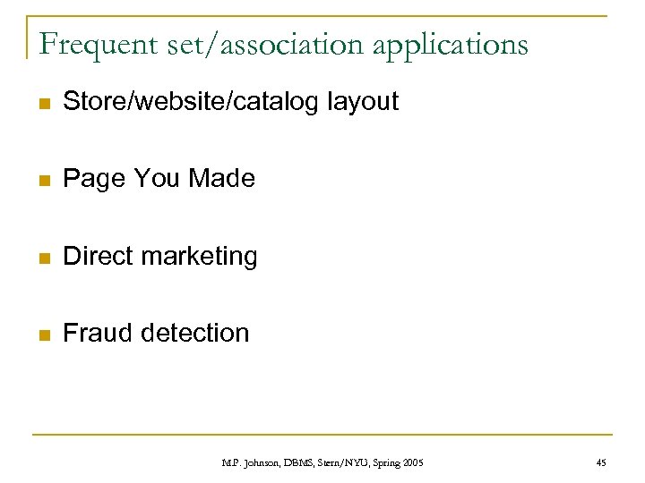 Frequent set/association applications n Store/website/catalog layout n Page You Made n Direct marketing n Fraud detection M. P. Johnson, DBMS, Stern/NYU, Spring 2005 45