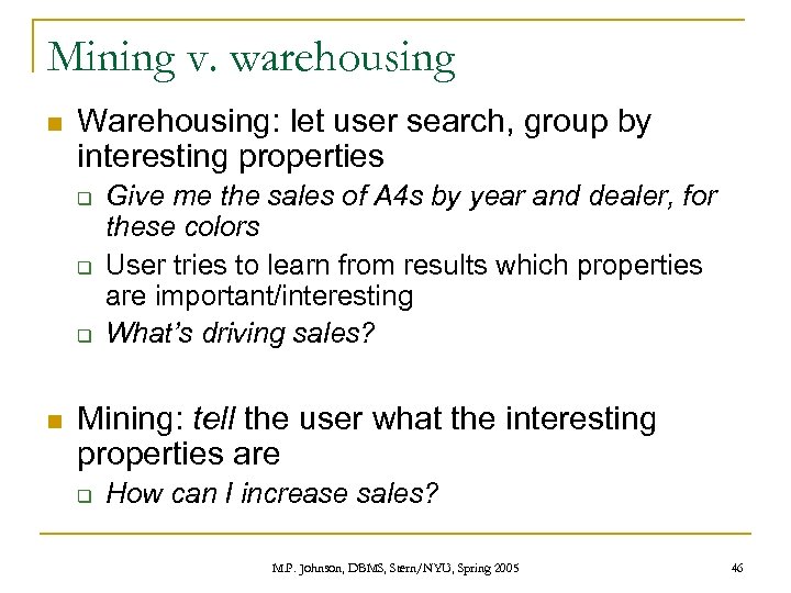 Mining v. warehousing n Warehousing: let user search, group by interesting properties q q q n Give me the sales of A 4 s by year and dealer, for these colors User tries to learn from results which properties are important/interesting What’s driving sales? Mining: tell the user what the interesting properties are q How can I increase sales? M. P. Johnson, DBMS, Stern/NYU, Spring 2005 46