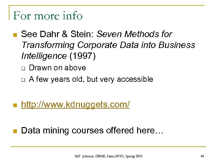For more info n See Dahr & Stein: Seven Methods for Transforming Corporate Data into Business Intelligence (1997) q q Drawn on above A few years old, but very accessible n http: //www. kdnuggets. com/ n Data mining courses offered here… M. P. Johnson, DBMS, Stern/NYU, Spring 2005 48