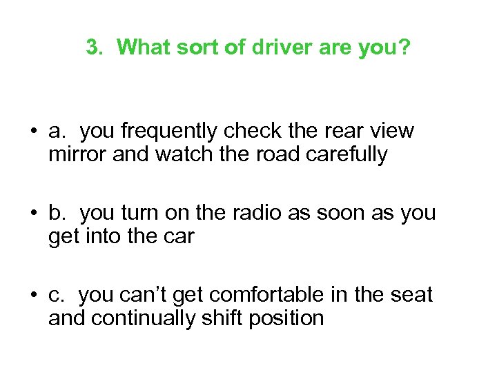 3. What sort of driver are you? • a. you frequently check the rear view mirror and watch the road carefully • b. you turn on the radio as soon as you get into the car • c. you can’t get comfortable in the seat and continually shift position