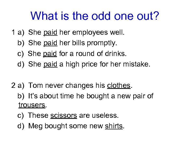 What is the odd one out? 1 a) b) c) d) She paid her employees well. She paid her bills promptly. She paid for a round of drinks. She paid a high price for her mistake. 2 a) Tom never changes his clothes. b) It’s about time he bought a new pair of trousers. c) These scissors are useless. d) Meg bought some new shirts.