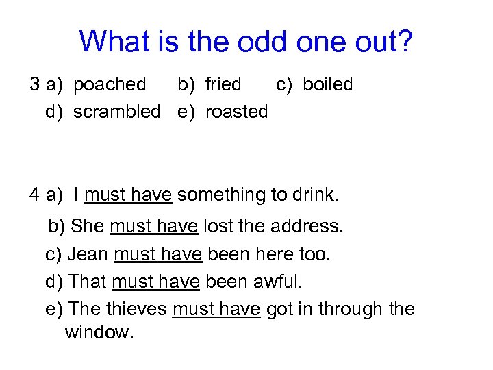 What is the odd one out? 3 a) poached b) fried c) boiled d) scrambled e) roasted 4 a) I must have something to drink. b) She must have lost the address. c) Jean must have been here too. d) That must have been awful. e) The thieves must have got in through the window.