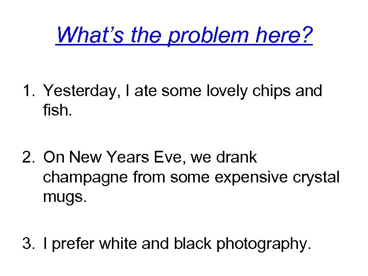 What’s the problem here? 1. Yesterday, I ate some lovely chips and fish. 2. On New Years Eve, we drank champagne from some expensive crystal mugs. 3. I prefer white and black photography.
