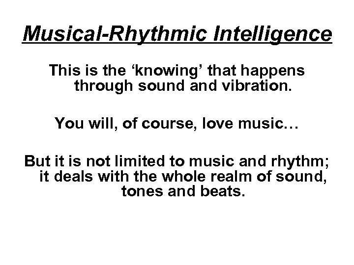 Musical-Rhythmic Intelligence This is the ‘knowing’ that happens through sound and vibration. You will, of course, love music… But it is not limited to music and rhythm; it deals with the whole realm of sound, tones and beats.