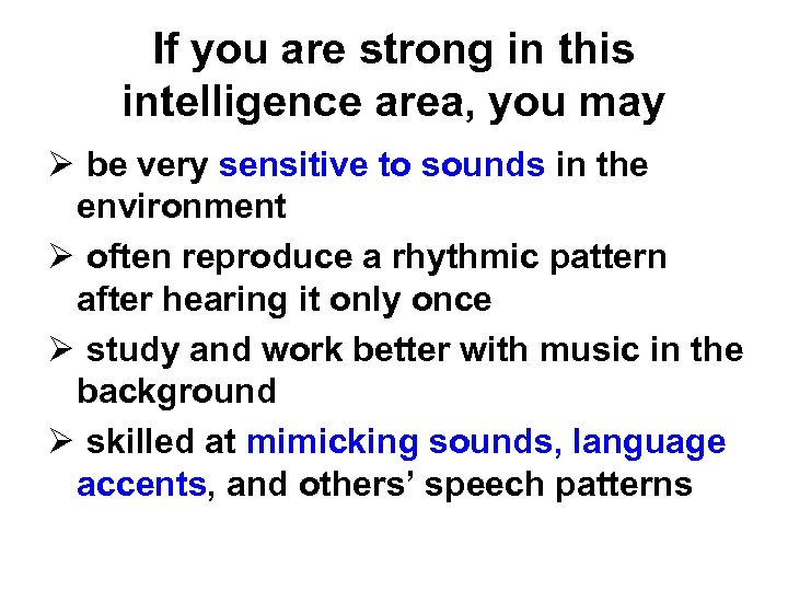 If you are strong in this intelligence area, you may Ø be very sensitive to sounds in the environment Ø often reproduce a rhythmic pattern after hearing it only once Ø study and work better with music in the background Ø skilled at mimicking sounds, language accents, and others’ speech patterns