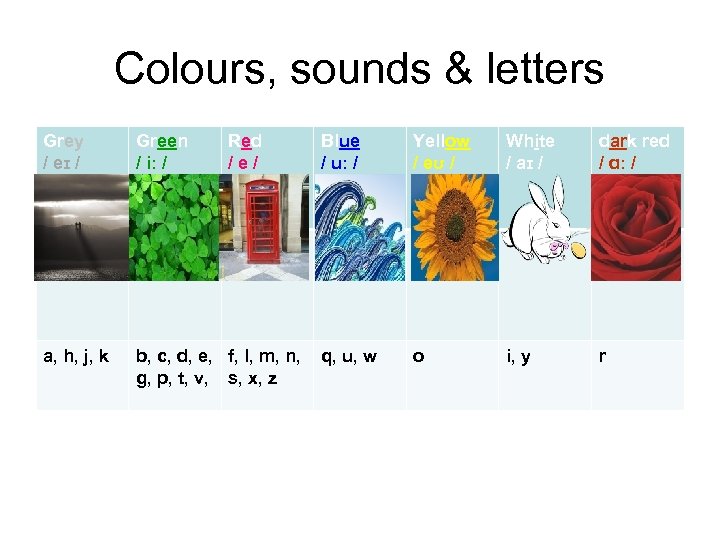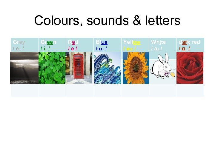 Colours, sounds & letters Grey / eɪ / Green / iː / Red / e / Blue / uː / Yellow / əʊ / White / aɪ / dark red / ɑː /