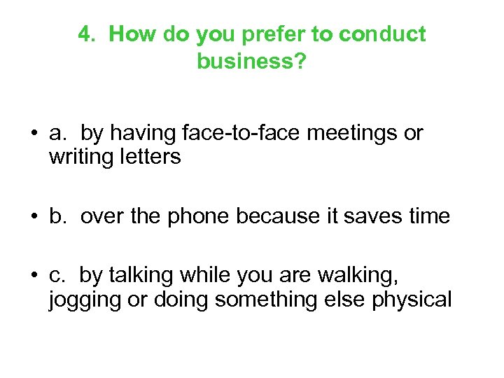 4. How do you prefer to conduct business? • a. by having face-to-face meetings or writing letters • b. over the phone because it saves time • c. by talking while you are walking, jogging or doing something else physical
