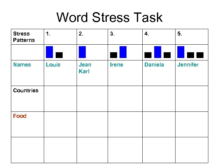 Word Stress Task Stress Patterns Countries Food 3. 4. █▄ Names 1. 1 hbn□□█ 2. 5. █ ▄█ ▄█▄ █▄▄ Louis Jean Karl Irene Daniela Jennifer