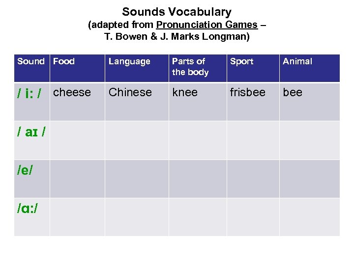 Sounds Vocabulary (adapted from Pronunciation Games – T. Bowen & J. Marks Longman) Sound Food Language Parts of the body Sport Animal / i: / cheese Chinese knee frisbee / aɪ / /e/ /ɑ: /