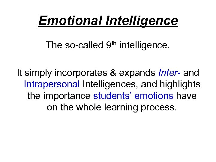 Emotional Intelligence The so-called 9 th intelligence. It simply incorporates & expands Inter- and Intrapersonal Intelligences, and highlights the importance students’ emotions have on the whole learning process.