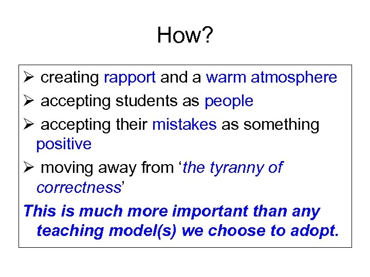 How? Ø creating rapport and a warm atmosphere Ø accepting students as people Ø accepting their mistakes as something positive Ø moving away from ‘the tyranny of correctness’ This is much more important than any teaching model(s) we choose to adopt.