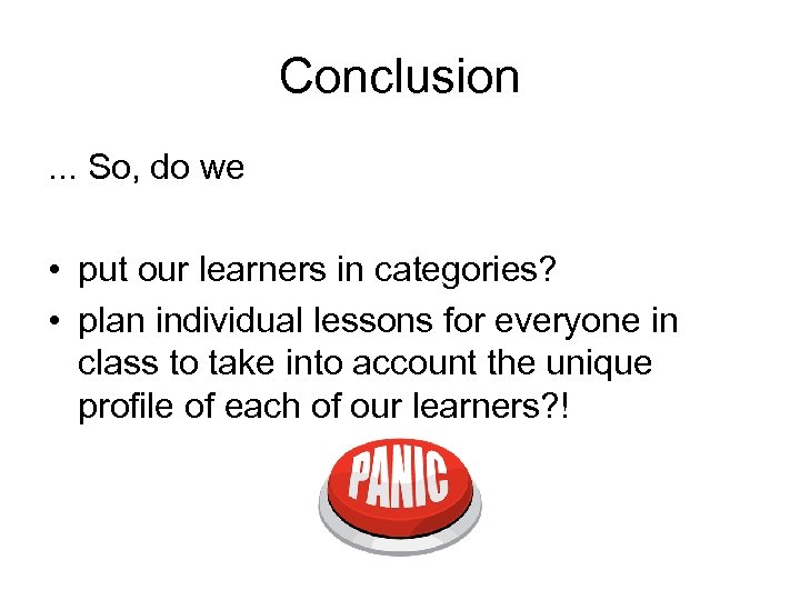Conclusion. . . So, do we • put our learners in categories? • plan individual lessons for everyone in class to take into account the unique profile of each of our learners? !