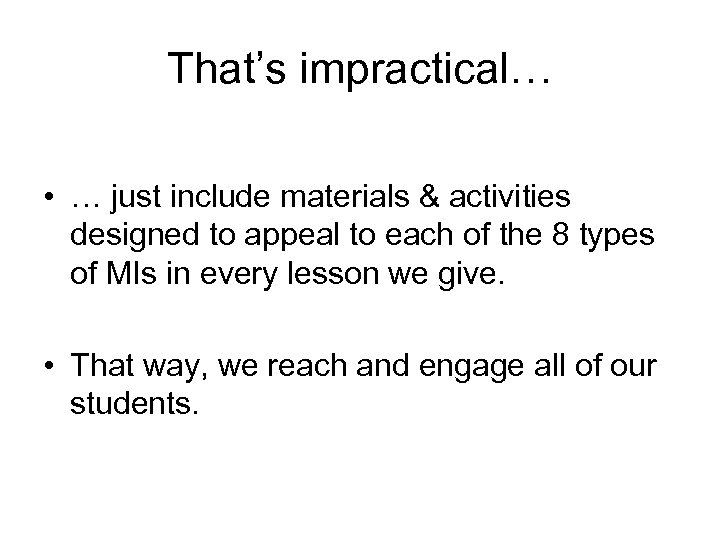 That’s impractical… • … just include materials & activities designed to appeal to each of the 8 types of MIs in every lesson we give. • That way, we reach and engage all of our students.