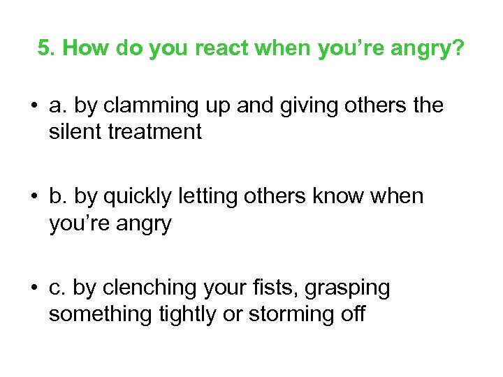 5. How do you react when you’re angry? • a. by clamming up and giving others the silent treatment • b. by quickly letting others know when you’re angry • c. by clenching your fists, grasping something tightly or storming off