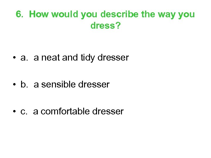 6. How would you describe the way you dress? • a. a neat and tidy dresser • b. a sensible dresser • c. a comfortable dresser