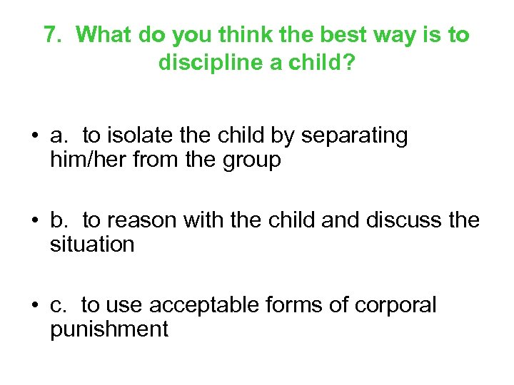 7. What do you think the best way is to discipline a child? • a. to isolate the child by separating him/her from the group • b. to reason with the child and discuss the situation • c. to use acceptable forms of corporal punishment