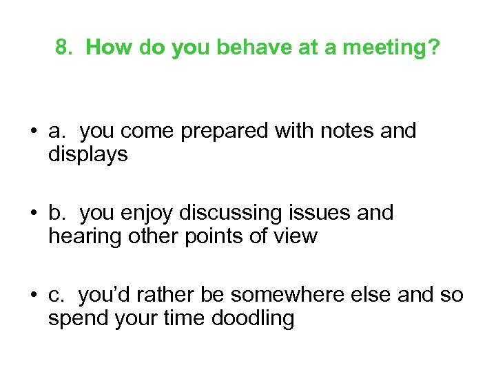 8. How do you behave at a meeting? • a. you come prepared with notes and displays • b. you enjoy discussing issues and hearing other points of view • c. you’d rather be somewhere else and so spend your time doodling