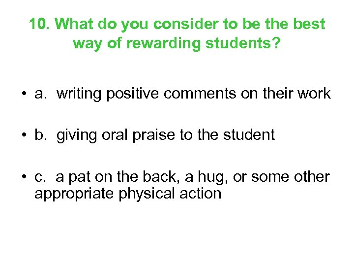 10. What do you consider to be the best way of rewarding students? • a. writing positive comments on their work • b. giving oral praise to the student • c. a pat on the back, a hug, or some other appropriate physical action