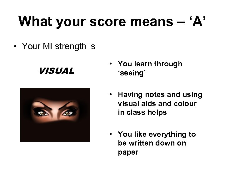 What your score means – ‘A’ • Your MI strength is VISUAL • You learn through ‘seeing’ • Having notes and using visual aids and colour in class helps • You like everything to be written down on paper