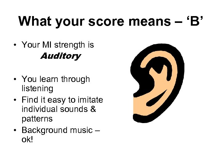 What your score means – ‘B’ • Your MI strength is Auditory • You learn through listening • Find it easy to imitate individual sounds & patterns • Background music – ok!