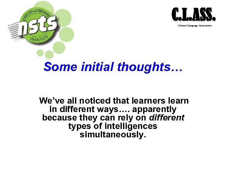 C. L. ASS. Cultural Language Association Some initial thoughts… We’ve all noticed that learners learn in different ways…. apparently because they can rely on different types of intelligences simultaneously.