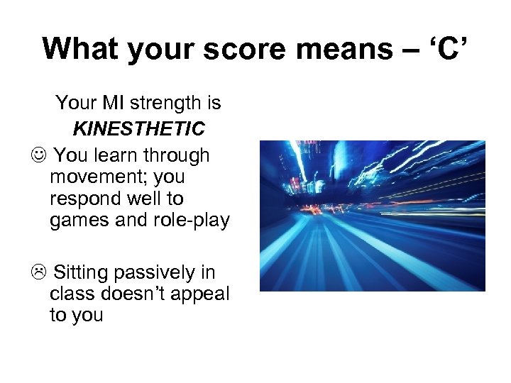 What your score means – ‘C’ Your MI strength is KINESTHETIC You learn through movement; you respond well to games and role-play Sitting passively in class doesn’t appeal to you