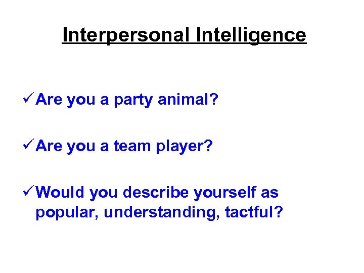 Interpersonal Intelligence ü Are you a party animal? ü Are you a team player? ü Would you describe yourself as popular, understanding, tactful?