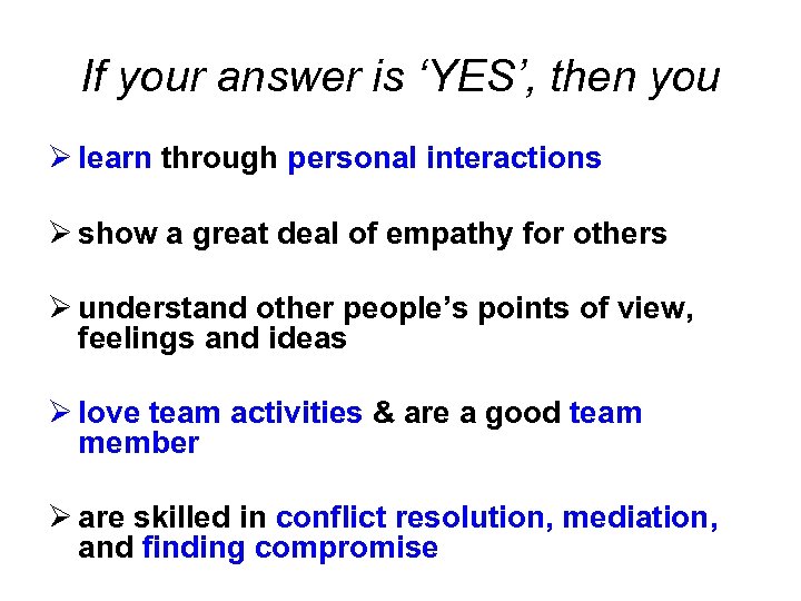 If your answer is ‘YES’, then you Ø learn through personal interactions Ø show a great deal of empathy for others Ø understand other people’s points of view, feelings and ideas Ø love team activities & are a good team member Ø are skilled in conflict resolution, mediation, and finding compromise