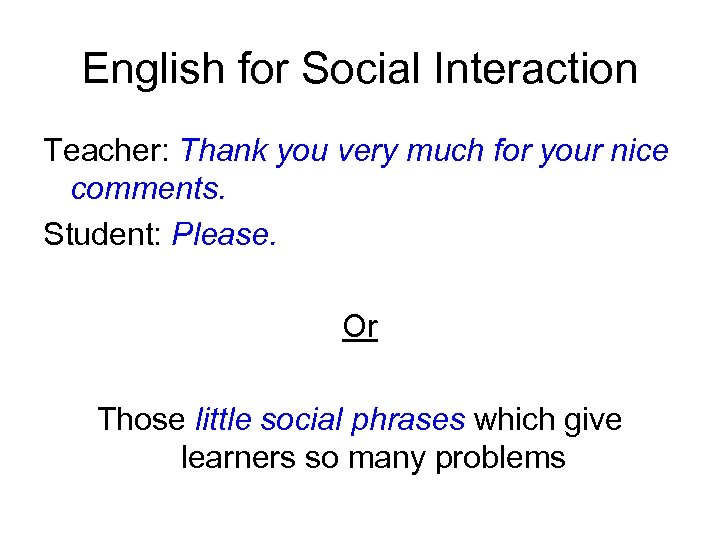 English for Social Interaction Teacher: Thank you very much for your nice comments. Student: Please. Or Those little social phrases which give learners so many problems