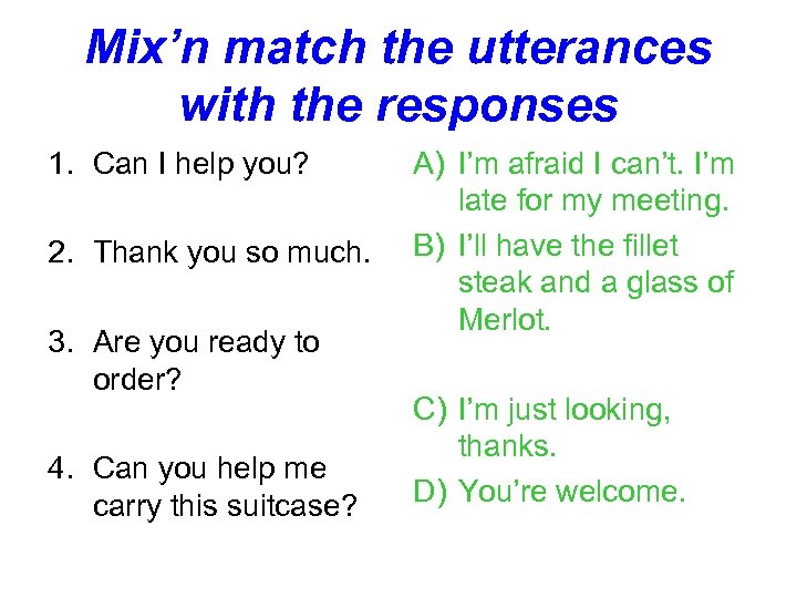 Mix’n match the utterances with the responses 1. Can I help you? 2. Thank you so much. 3. Are you ready to order? 4. Can you help me carry this suitcase? A) I’m afraid I can’t. I’m late for my meeting. B) I’ll have the fillet steak and a glass of Merlot. C) I’m just looking, thanks. D) You’re welcome.