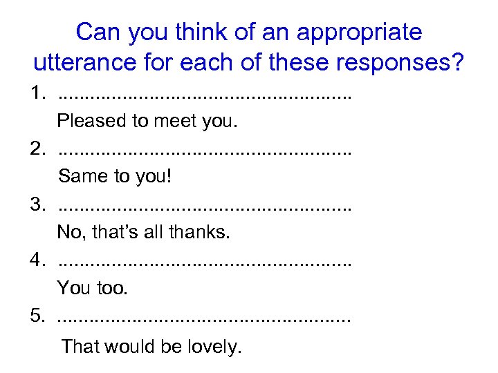 Can you think of an appropriate utterance for each of these responses? 1. . . . Pleased to meet you. 2. . . . Same to you! 3. . . . No, that’s all thanks. 4. . . . You too. 5. . . . That would be lovely.
