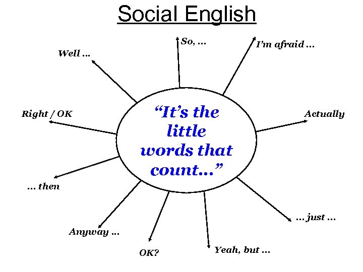 Social English So, . . . I’m afraid. . . Well. . . Right / OK “It’s the little words that count. . . ” Actually . . . then. . . just. . . Anyway. . . OK? Yeah, but. . .