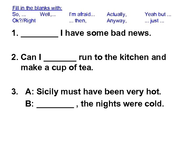 Fill in the blanks with: So, . . . Well, . . . Ok? /Right I’m afraid. . . then, Actually, Anyway, Yeah but. . . just. . . 1. ____ I have some bad news. 2. Can I _______ run to the kitchen and make a cup of tea. 3. A: Sicily must have been very hot. B: ____ , the nights were cold.