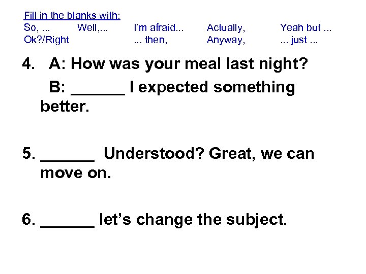 Fill in the blanks with: So, . . . Well, . . . Ok? /Right I’m afraid. . . then, Actually, Anyway, Yeah but. . . just. . . 4. A: How was your meal last night? B: ______ I expected something better. 5. ______ Understood? Great, we can move on. 6. ______ let’s change the subject.