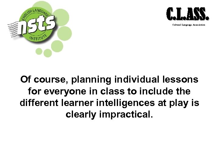 C. L. ASS. Cultural Language Association Of course, planning individual lessons for everyone in class to include the different learner intelligences at play is clearly impractical.