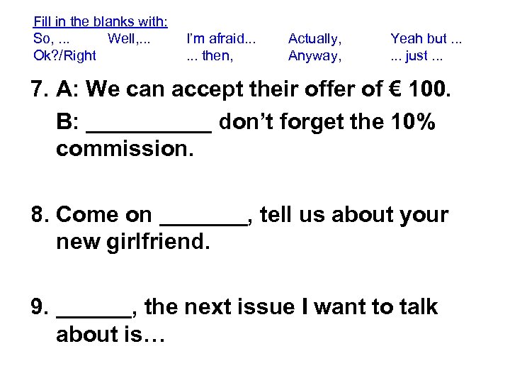 Fill in the blanks with: So, . . . Well, . . . Ok? /Right I’m afraid. . . then, Actually, Anyway, Yeah but. . . just. . . 7. A: We can accept their offer of € 100. B: _____ don’t forget the 10% commission. 8. Come on _______, tell us about your new girlfriend. 9. ______, the next issue I want to talk about is…