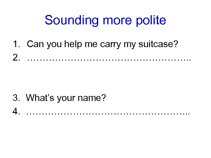 Sounding more polite 1. Can you help me carry my suitcase? 2. ………………………. . 3. What’s your name? 4. ………………………. .