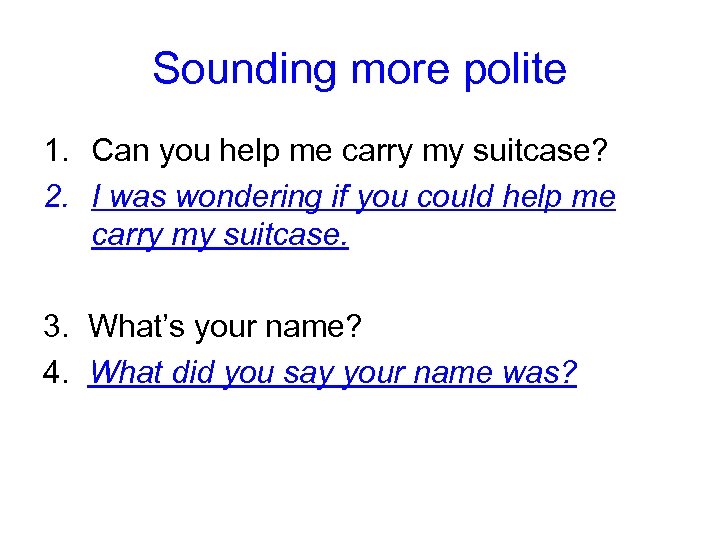 Sounding more polite 1. Can you help me carry my suitcase? 2. I was wondering if you could help me carry my suitcase. 3. What’s your name? 4. What did you say your name was?