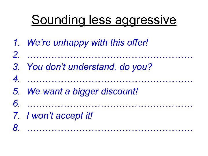 Sounding less aggressive 1. 2. 3. 4. 5. 6. 7. 8. We’re unhappy with this offer! ……………………… You don’t understand, do you? ……………………… We want a bigger discount! ……………………… I won’t accept it! ………………………