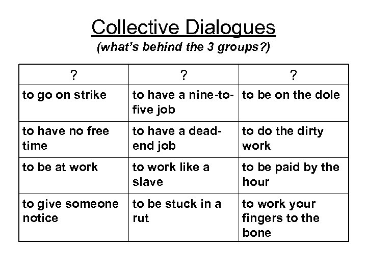 Collective Dialogues (what’s behind the 3 groups? ) ? ? ? to go on strike to have a nine-to- to be on the dole five job to have no free time to have a deadend job to do the dirty work to be at work to work like a slave to be paid by the hour to give someone to be stuck in a notice rut to work your fingers to the bone