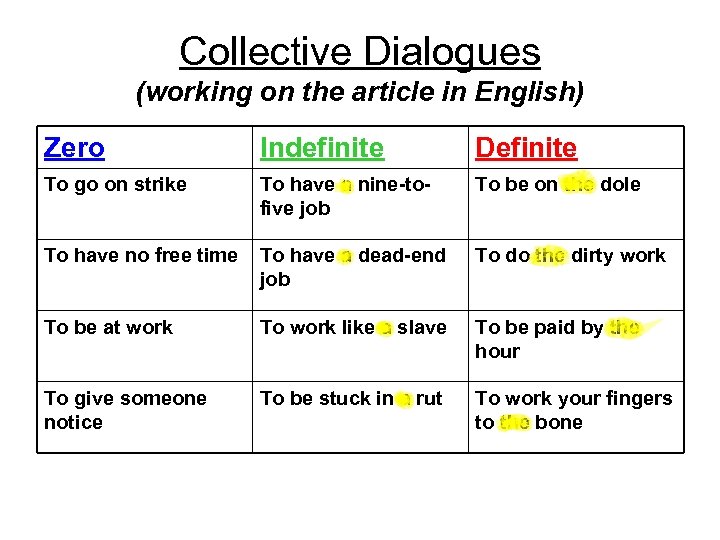 Collective Dialogues (working on the article in English) Zero Indefinite Definite To go on strike To have a nine-tofive job To be on the dole To have no free time To have a dead-end job To do the dirty work To be at work To work like a slave To be paid by the hour To give someone notice To be stuck in a rut To work your fingers to the bone