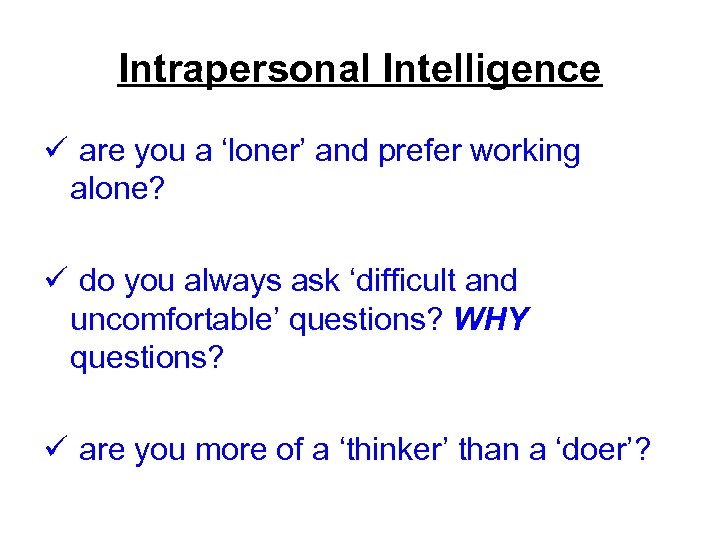 Intrapersonal Intelligence ü are you a ‘loner’ and prefer working alone? ü do you always ask ‘difficult and uncomfortable’ questions? WHY questions? ü are you more of a ‘thinker’ than a ‘doer’?