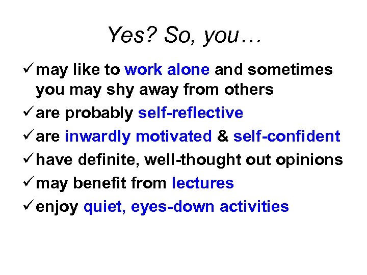 Yes? So, you… ü may like to work alone and sometimes you may shy away from others ü are probably self-reflective ü are inwardly motivated & self-confident ü have definite, well-thought out opinions ü may benefit from lectures ü enjoy quiet, eyes-down activities
