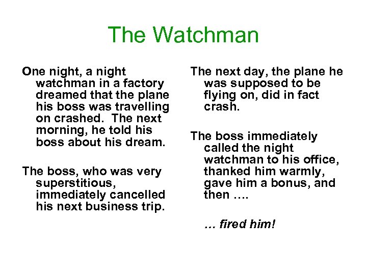 The Watchman One night, a night watchman in a factory dreamed that the plane his boss was travelling on crashed. The next morning, he told his boss about his dream. The boss, who was very superstitious, immediately cancelled his next business trip. The next day, the plane he was supposed to be flying on, did in fact crash. The boss immediately called the night watchman to his office, thanked him warmly, gave him a bonus, and then …. … fired him!