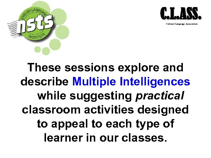 C. L. ASS. Cultural Language Association These sessions explore and describe Multiple Intelligences while suggesting practical classroom activities designed to appeal to each type of learner in our classes.